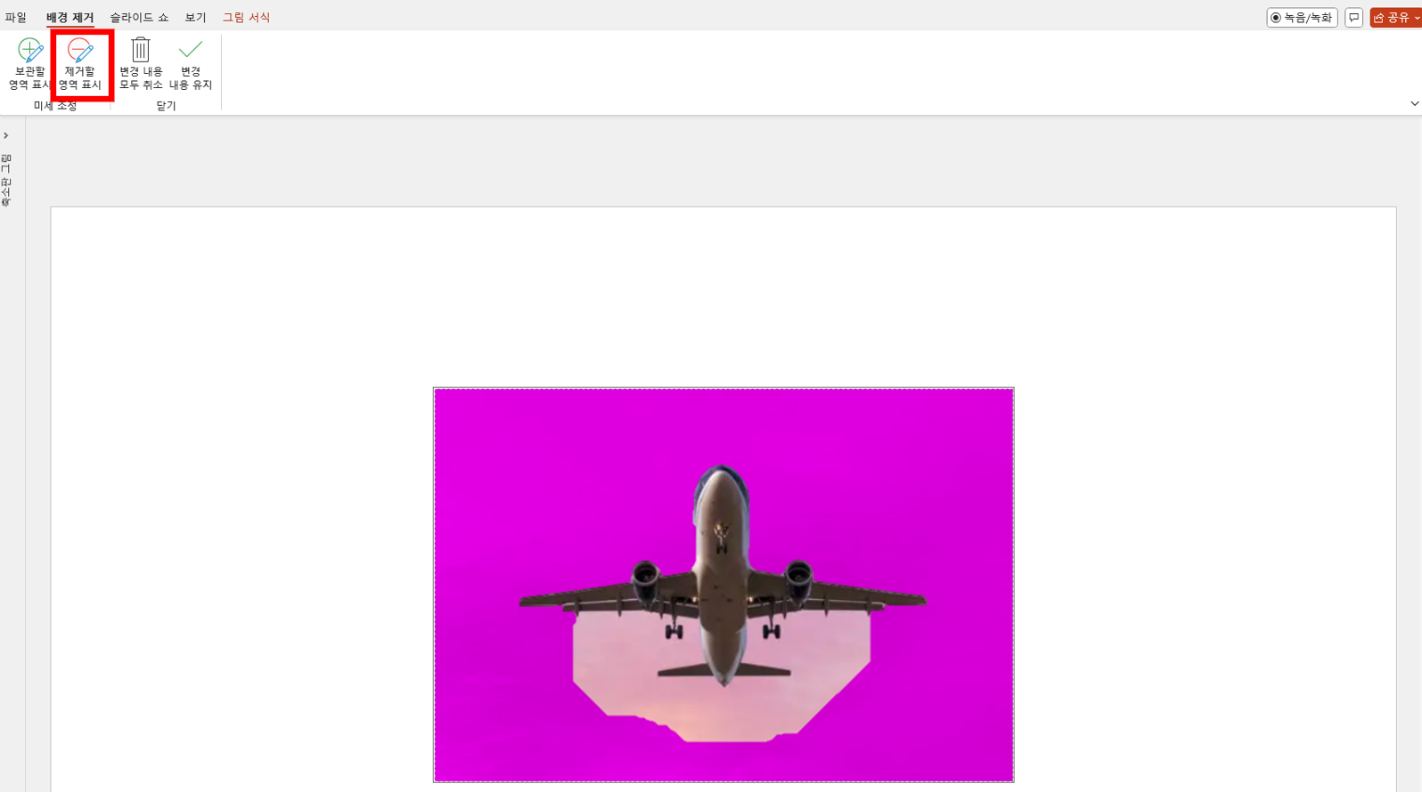 "배경 제거"를 클릭하면 아래와 같이 PPT에서 인식한 "배경"에 해당 되는 부분들에 색상이 입혀진다.