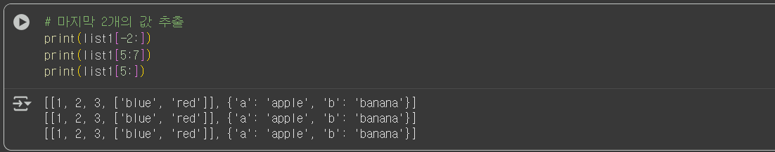 (e.g. list1[ : 3] 은 처음부터 2번째 인덱스까지 추출을 의미함)